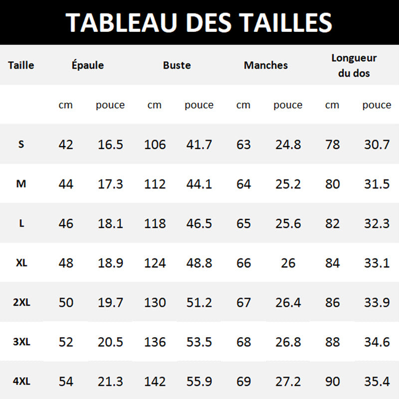 Taille : S, M, L, XL, 2XL, 3XL, 4XL
